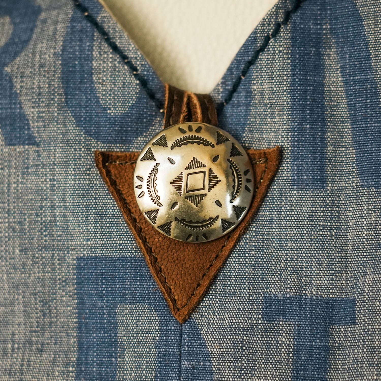 シャンブレーの青、アイロンロゴの掠れ、コンチョの艶、ディアスキンの質感。